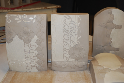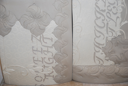 Though only two shown are complete, today I finished five new sized and shaped tile forms: three are larger rectangles, and two are a new arched form. (They currently measure 11″h x 7 1/2″w x 2″d in this leatherhard stage, but have some shrinking to do.) I continue to be very excited about these wall/mantel pieces. They are one of the most enjoyable forms I make.