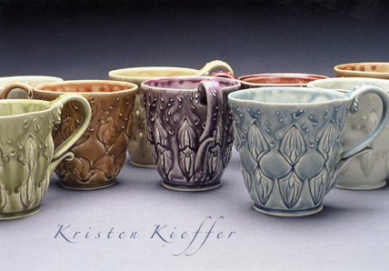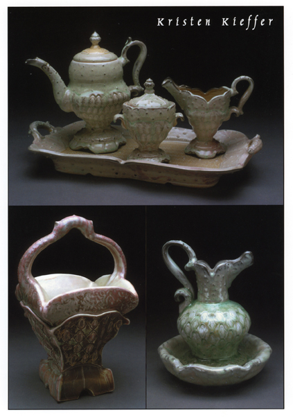 I have had a “publicity” postcard made every year or two since 2001. (There are two other postcards from ’95 and ’98 I’ll have to dig up for another—more humorous—post.) The two most recent cards, with the jars and cups, are cone 7 electric; the others are cone 10 soda reduction. The image directly above is my MFA graduation show card from Ohio University. Six postcards of work from four different studios. It’s interesting to see how things have changed, most notably after my thesis card, going from what I see as just “ornate” to more “elegant”. Aside from additional layering, the surfaces haven’t changed a lot, but the lines that define the forms have. They are more crisp and where I see the elegance happening. I was the photographer for all of these too, baring witness to the transition from film to digital.