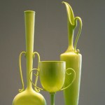 First row, from left: Vase Gauffré by Ionna Vautrin & Guillaume Delvigne for Industreal; Brasilia stripes cone vase by Jonathan Adler; Panier percé by Guillaume Delvigne & Ionna Vautrin for Industreal; Second row: Helix tall vase by Jonathan Adler; Hula Hoop by Cristiana Giopato for Industreal; Burano by Michele de Lucchi for Industreal; Blooming over cup by Mina Wu & Jan B. for Droog; Third row: Anamorphic cups by Ross McBride; Royal Delft vase by Marcel Wanders for Moooi; Grooveware by Ross McBride; Gravy boat and spoon by Eva Zeisel; Fourth row: Airborne Snotty Vase by Marcel Wanders; Fifth row: two more Royal Delft vases by M. Wanders for Moooi; Table Stories by Tord Boontje; Last row: Primavera tile by Tord Boontje for Bardelli; The Other Side Ceramics by Tord Boontje for Moroso; and Still Lfe: Black Bisque by KleinReid.