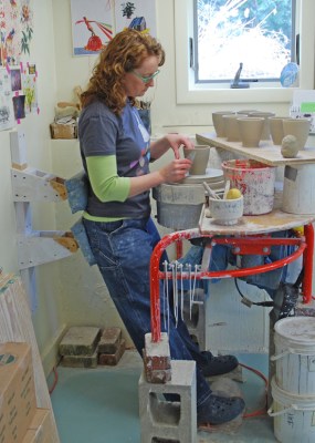 PS: Below is an image of me at my worktable stamping pots. Note how I stack several bats on my banding wheel (my parting gift from my assistantship/residency with John!) so that I’m working about chest high, not hunched over.