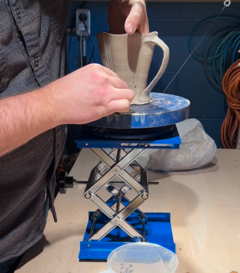 Studio potter Eric Ordway & Henrik Van Ryzin use a tabletop scissor lift to elevate in-progress pieces to a more comfortable working height. (Like how I stack my bats under my banding wheel, but way more elegant!)