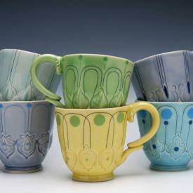 So, I can say whatever I want about my work, but if I want them to be perceived the way I voice, I need to back up my verbal claims in 3D. The best example I can give are my cups. 10 years ago, the handles were thin, narrow and gestured far above the lip line, and were therefore worrisome to hold. Additionally, the small piece of the two-piece handle had a curlicue, which didn’t lend to durability, and the cups themselves were modestly sized. Now, the cups are “mugs” with a generous shape, the handles are plump and feel inviting, and though still two pieces, are streamlined. When people pick up my cups, I hope they feel that “ornamented strength” (not delicateness), which invites use.