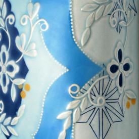 The “ornamented strength” phrase is also from my slide presentations. I show a picture of Lynda Carter as Wonder Woman and Cate Blanchett as Queen Elizabeth to illustrate how “feminine” (not normally associated with “durability”) can be strong as well patterned. That is where I see my work, thus my tagline, “Ornately elegant pottery for everyday.” “Everyday” implies strength.