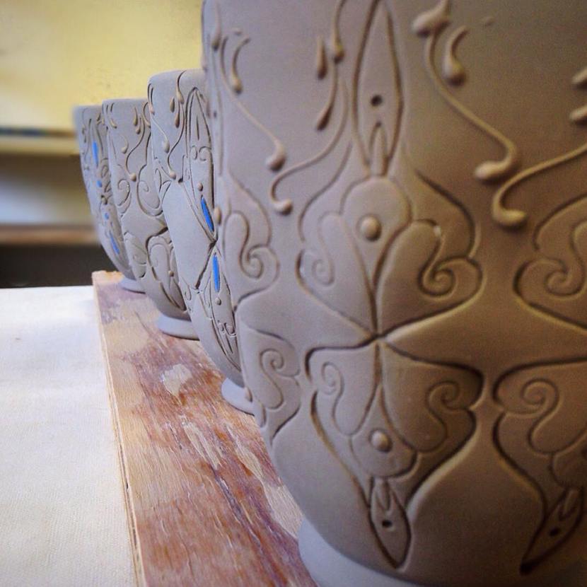 Leatherhard stamped and slip-trailed mugs Published on March 30, 2016 at 1074 × 1074 in Process « Previous Next »