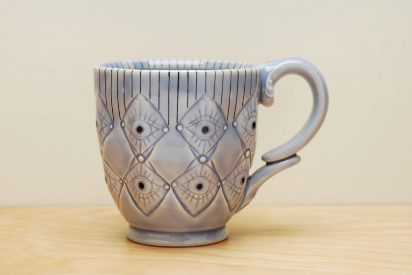 Stamped Deco mug w. eyes in Periwinkle and black Published on April 29, 2020 at 840 × 560 in Sold « Previous Next »