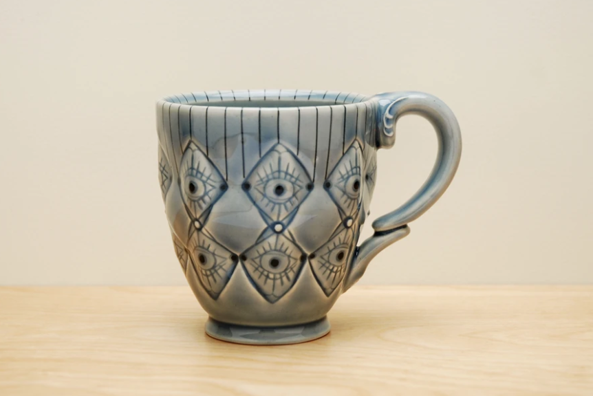 Stamped mug w. eyes and pinstripes in Ocean Published on February 4, 2020 at 862 × 576 in Sold « Previous Next »