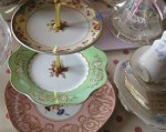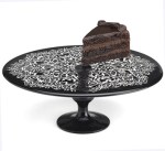 If you hover your cursor over the pics above, you can get most of the info below too. From top left: Vintage glass cake stands with cakes; Esther Coombs’ 3-tier Rose Cake Stand, EstherCoombs on Etsy; and Karl Lagerfeld for Chanel dress paired with wedding cakes, Trend de la Creme blog post; Second row: Blaue Blume cake stand by Tina Tsang; The Husband Catcher Cake, oil painting by Janet Hill; and Art Deco cake stencil wrapper from Fancy Flours; Third row: Silver cake stand;and Maren Kloppmann’s Ledge Platter; Fourth row: Whitney Smith’s Bird Cupcake Stand, WhitneySmith on Etsy; Lemon cake with blue icing and dots, Country Living photo shoot; and Iacolli & Mcalllister cake stands on Big Cartel; Fifth row: Kari Radasch’s cake stand with confetti cake, Redware on Etsy; Lazy Daisy skirts by Made With Love By Hannah (cake stands have skirts, and these are super cute!); and w2products Willow cake stand; Sixth row:  Jeanette Zeis’ Lace cake plate, vesselsandwares on Etsy; 4 Layer Cake, oil painting by Paul Ferney; and antique three-tier cake stand;  Seventh row:  reproduction of 1930s-era glass cake stand; D’lovely cake stand, fergusonpottery on Etsy; and Elle cake stand by Clara French; Last row:  cake stand from The Tea Pot Shoppe; striped cake by The Yummy Cake Company; and Black Lace Cake Stand from the MoMA store.