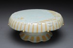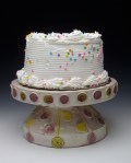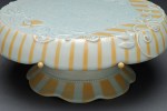 As a lover of cake (as influence as well as treat), it makes sense that I would make cake stands. Several years ago, I did make a couple, but lost interest (and apparently didn’t even photograph them).  However!  My new venture into polka dots and stripes in general, and stripe-y plates specifically, has gotten me jazzed to wrap ribbons of striped color down and around to accentuate this fun form.  Above are two recently completed cake stands I photographed from various angles.  Both are about 4″ h x 10″ diameter (able to display an 8 & 9″ cake respectively) with glossy tops and satin-glazed sides.