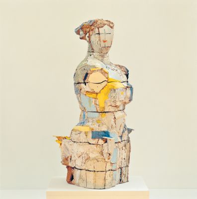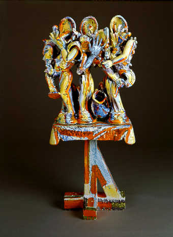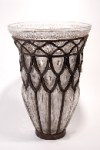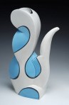 My new, large (15″ h) wire lattice vase is intended, however, to be more sculptural than functional, and is a slight mash-up of form inspiration between a small, cobalt blue glass vase of my Great Grandma’s (similar to the first image below) and a brass antique find that sits in my studio. The wire creates an airy finish to the top of the vase, appearing a bit like a blue-print drawing, a crinoline framework or the unfinished, underlying architecture of the clay part itself. The wire is a way for me to draw in three-dimensions and is a nice contrast material to the clay. (I enjoy working with the wire, but the humbling nature of clay and its shrinkage does not always cooperate with my master plans for elaborate wirework, so we’ll see how it fairs in the firings). I, of course, finished this muscular form off with suggestions of Victorian wallpaper layered over mod candy stripes.